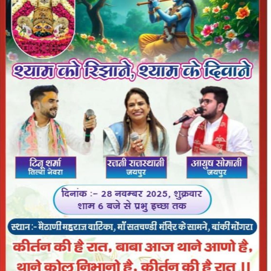 ज्ञात हो कि बाॅंकीमोंगरा में विगत 04 वर्षों से नगर के श्री श्याम दीवाने मित्र मंडल बाॅंकीमोंगरा के द्वारा बाबा श्याम का भव्य संकीर्तन महोत्सव कराया जा रहा है, जो इस वर्ष भी 27 एवं 28 नवंबर को किया जा रहा है।