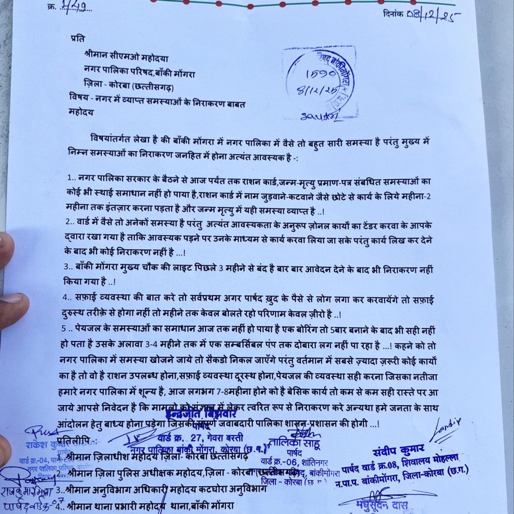 नगर पालिका परिषद बाँकी मोंगरा में विपक्षी पार्षदों ने सीएमओ को सौपा ज्ञापन