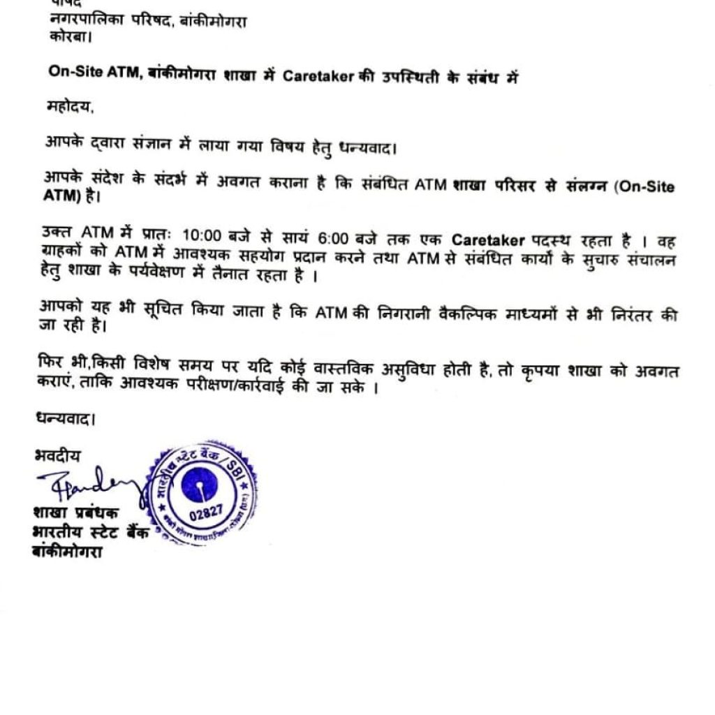 कोरबा जिले के बांकीमोंगरा क्षेत्र के एसबीआई बैंक के समीप एटीएम (ATM) केंद्र में सुरक्षा और व्यवस्था को लेकर लंबे समय से चली आ रही समस्या का अब समाधान होने जा रहा है। बांकीमोंगरा के वार्ड क्रमांक 13 कटाईनार पार्षद अश्वनी मिश्रा की जनहित से जुड़ी मांग को बैंक प्रबंधन ने गंभीरता से लेते हुए एटीएम केंद्र पर केयरटेकर तैनात करने का निर्णय लिया है।